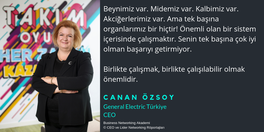 Canan Özsoy: Bunun için çok güzel bir örnek var. Bedenimiz! Beynimiz var. Midemiz var. Kalbimiz var. Akciğerlerimiz var. Ama tek başına organlarımız bir hiçtir! Önemli olan bir sistem içerisinde çalışmaktır. Senin tek başına çok iyi olman başarıyı getirmiyor. Birlikte çalışmak, birlikte çalışılabilir olmak önemlidir.